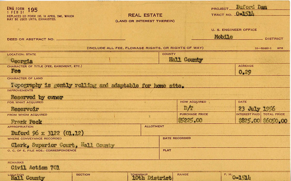 Welcome to Lake Lanier’s Reservoir Land & Property Archival Program. This tool will allow you to locate information on land and other property the government purchased for Lake Sidney Lanier. You can search for property information by the owner’s full name, the owner’s last name, the tract number, and county the property was located in.