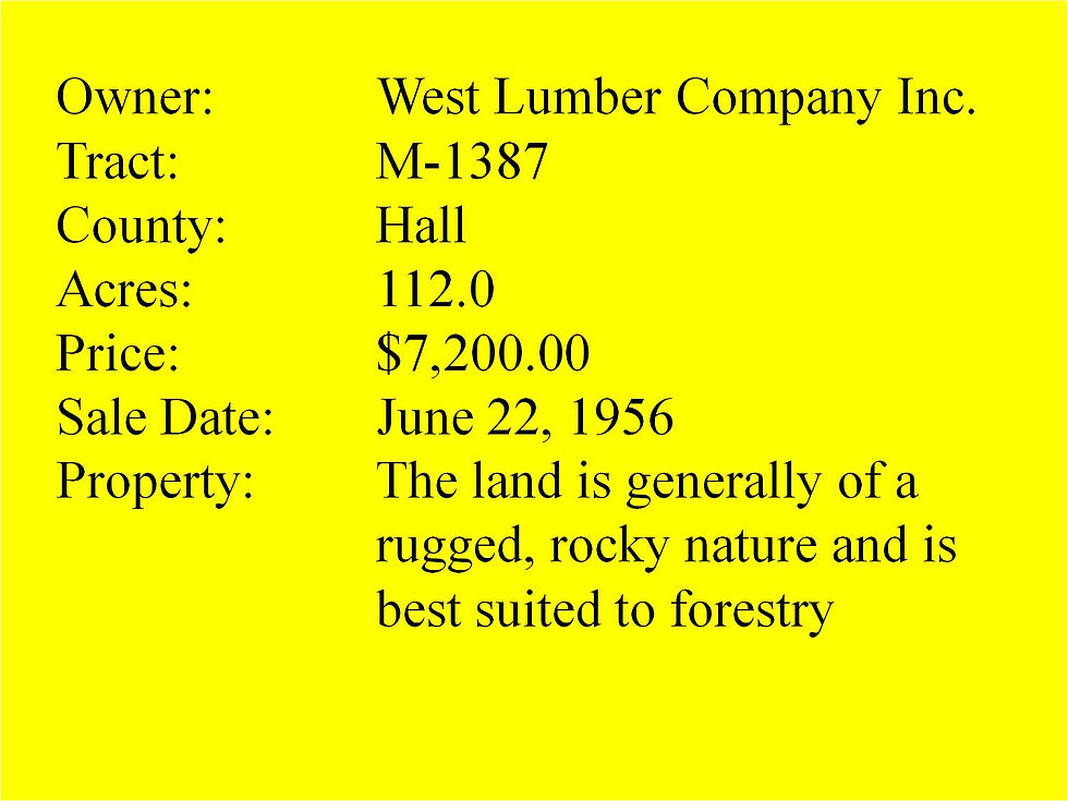 An abridged collection of data is provided for each tract of land. Data sheets detailing the owner’s name, tract number of the property, the county it was located in, the acreage purchased, the price paid by the government for the property and a description of what the property was used for is provided for each tract. Government promissory deed records are provided for most of the tracts. Some contain photographs of improvements made on the property to help determine the fair market value of property.