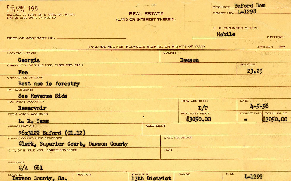 Welcome to Lake Lanier’s Reservoir Land & Property Archival Program. This tool will allow you to locate information on land and other property the government purchased for Lake Sidney Lanier. You can search for property information by the owner’s full name, the owner’s last name, the tract number, and county the property was located in.