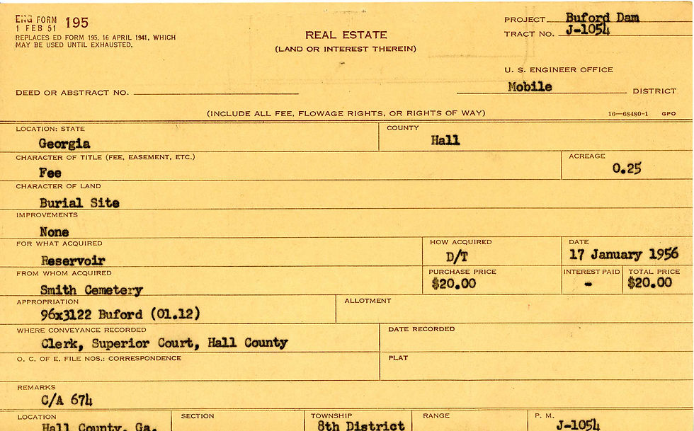 An abridged collection of data is provided for each tract of land. Data sheets detailing the owner’s name, tract number of the property, the county it was located in, the acreage purchased, the price paid by the government for the property and a description of what the property was used for is provided for each tract. Government promissory deed records are provided for most of the tracts. Some contain photographs of improvements made on the property to help determine the fair market value of property.