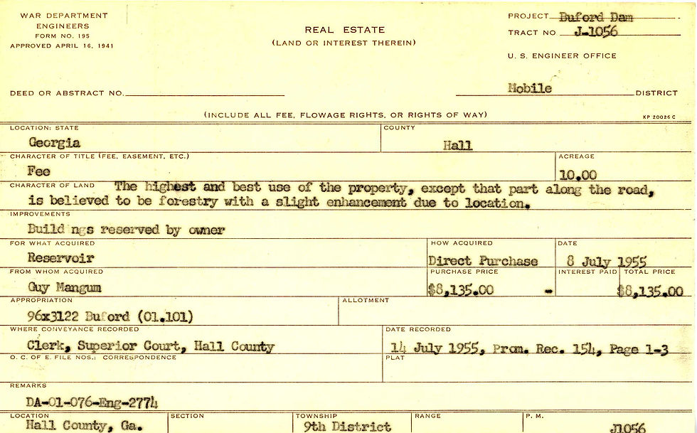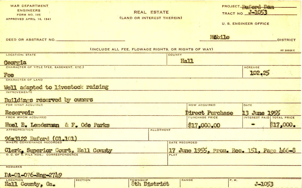 Welcome to Lake Lanier’s Reservoir Land & Property Archival Program. This tool will allow you to locate information on land and other property the government purchased for Lake Sidney Lanier. You can search for property information by the owner’s full name, the owner’s last name, the tract number, and county the property was located in.