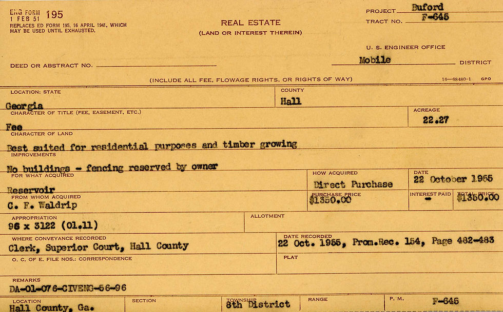 Welcome to Lake Lanier’s Reservoir Land & Property Archival Program. This tool will allow you to locate information on land and other property the government purchased for Lake Sidney Lanier. You can search for property information by the owner’s full name, the owner’s last name, the tract number, and county the property was located in.