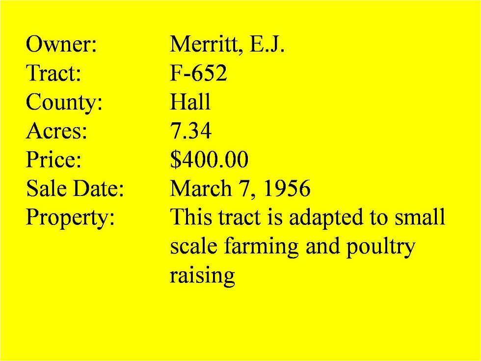 An abridged collection of data is provided for each tract of land. Data sheets detailing the owner’s name, tract number of the property, the county it was located in, the acreage purchased, the price paid by the government for the property and a description of what the property was used for is provided for each tract. Government promissory deed records are provided for most of the tracts. Some contain photographs of improvements made on the property to help determine the fair market value of property.