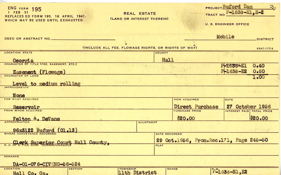 An abridged collection of data is provided for each tract of land. Data sheets detailing the owner’s name, tract number of the property, the county it was located in, the acreage purchased, the price paid by the government for the property and a description of what the property was used for is provided for each tract. Government promissory deed records are provided for most of the tracts. Some contain photographs of improvements made on the property to help determine the fair market value of property.